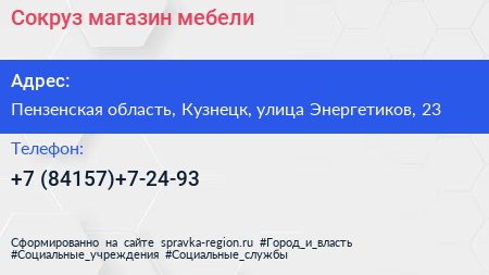 Сокруз, магазин мебели по адресу Пензенская область, Кузнецк, улица Энергетиков, 23 в дальнейшем Организация, размещена в следующих категориях: