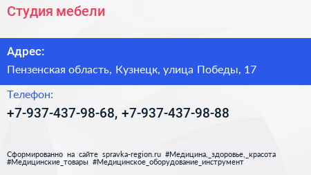 Студия мебели по адресу Пензенская область, Кузнецк, улица Победы, 17 в дальнейшем Организация, размещена в следующих категориях: