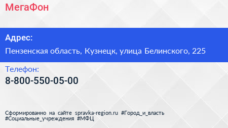 МегаФон по адресу Пензенская область, Кузнецк, улица Белинского, 225 в дальнейшем Организация, размещена в следующих категориях: