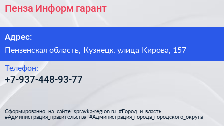 Пенза Информ-гарант по адресу Пензенская область, Кузнецк, улица Кирова, 157 в дальнейшем Организация, размещена в следующих категориях: