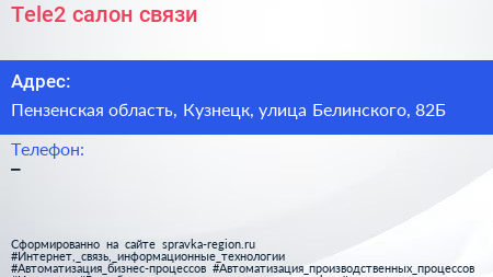 Tele2, салон связи по адресу Пензенская область, Кузнецк, улица Белинского, 82Б в дальнейшем Организация, размещена в следующих категориях: