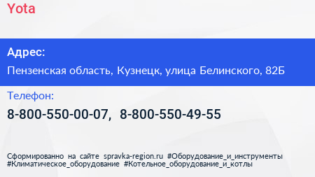 Yota по адресу Пензенская область, Кузнецк, улица Белинского, 82Б в дальнейшем Организация, размещена в следующих категориях: