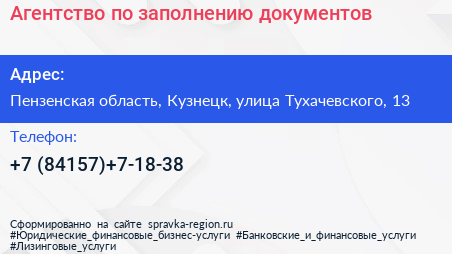 Агентство по заполнению документов по адресу Пензенская область, Кузнецк, улица Тухачевского, 13 в дальнейшем Организация, размещена в следующих категориях:
