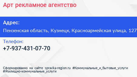 Арт, рекламное агентство по адресу Пензенская область, Кузнецк, Красноармейская улица, 127 в дальнейшем Организация, размещена в следующих категориях: