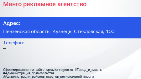 Манго, рекламное агентство по адресу Пензенская область, Кузнецк, Стекловская, 100 в дальнейшем Организация, размещена в следующих категориях: