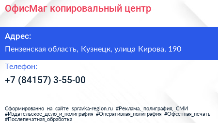 ОфисМаг, копировальный центр по адресу Пензенская область, Кузнецк, улица Кирова, 190 в дальнейшем Организация, размещена в следующих категориях: