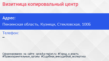 Визитница, копировальный центр по адресу Пензенская область, Кузнецк, Стекловская, 100Б в дальнейшем Организация, размещена в следующих категориях: