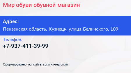 Мир обуви, обувной магазин по адресу Пензенская область, Кузнецк, улица Белинского, 109 в дальнейшем Организация, размещена в следующих категориях: