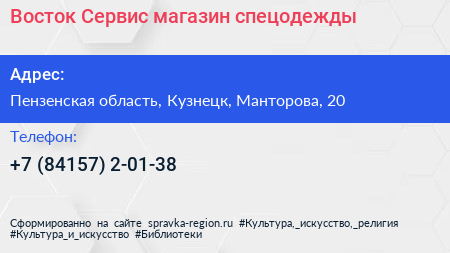Восток-Сервис, магазин спецодежды по адресу Пензенская область, Кузнецк, Манторова, 20 в дальнейшем Организация, размещена в следующих категориях: