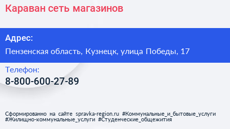 Караван, сеть магазинов по адресу Пензенская область, Кузнецк, улица Победы, 17 в дальнейшем Организация, размещена в следующих категориях: