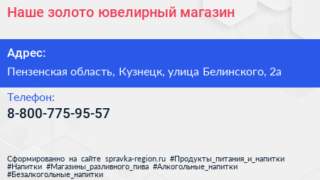 Наше золото, ювелирный магазин по адресу Пензенская область, Кузнецк, улица Белинского, 2а в дальнейшем Организация, размещена в следующих категориях: