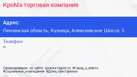 КроМа, торговая компания по адресу Пензенская область, Кузнецк, Алексеевское Шоссе, 5 в дальнейшем Организация, размещена в следующих категориях: