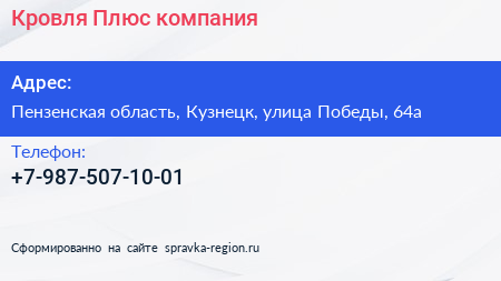 Кровля Плюс, компания по адресу Пензенская область, Кузнецк, улица Победы, 64а в дальнейшем Организация, размещена в следующих категориях: