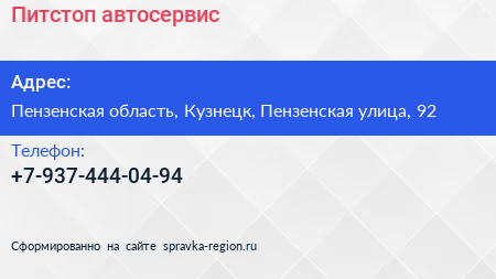 Питстоп, автосервис по адресу Пензенская область, Кузнецк, Пензенская улица, 92 в дальнейшем Организация, размещена в следующих категориях: