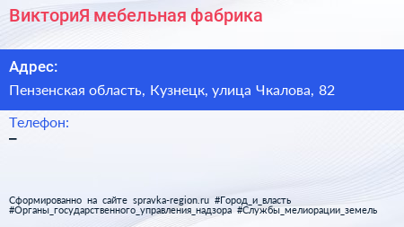 ВикториЯ, мебельная фабрика по адресу Пензенская область, Кузнецк, улица Чкалова, 82 в дальнейшем Организация, размещена в следующих категориях: