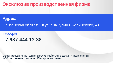 Эксклюзив, производственная фирма по адресу Пензенская область, Кузнецк, улица Белинского, 4а в дальнейшем Организация, размещена в следующих категориях: