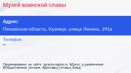 Музей воинской славы по адресу Пензенская область, Кузнецк, улица Ленина, 291а в дальнейшем Организация, размещена в следующих категориях: