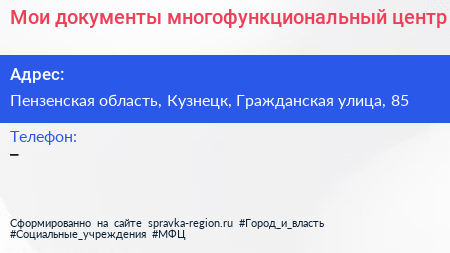 Мои документы, многофункциональный центр по адресу Пензенская область, Кузнецк, Гражданская улица, 85 в дальнейшем Организация, размещена в следующих категориях: