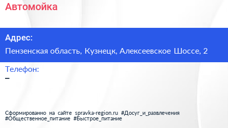 Автомойка по адресу Пензенская область, Кузнецк, Алексеевское Шоссе, 2 в дальнейшем Организация, размещена в следующих категориях: