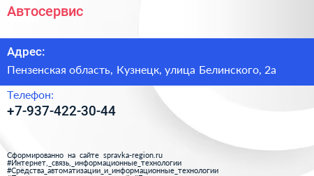 Автосервис по адресу Пензенская область, Кузнецк, улица Белинского, 2а в дальнейшем Организация, размещена в следующих категориях: