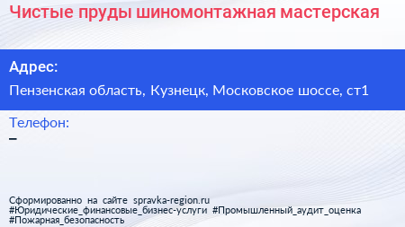 Чистые пруды, шиномонтажная мастерская по адресу Пензенская область, Кузнецк, Московское шоссе, ст1 в дальнейшем Организация, размещена в следующих категориях: