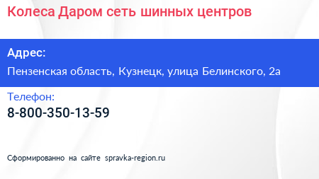 Колеса Даром, сеть шинных центров по адресу Пензенская область, Кузнецк, улица Белинского, 2а в дальнейшем Организация, размещена в следующих категориях: