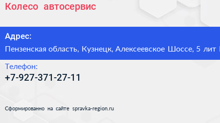 Колесо+, автосервис по адресу Пензенская область, Кузнецк, Алексеевское Шоссе, 5 лит Р в дальнейшем Организация, размещена в следующих категориях: