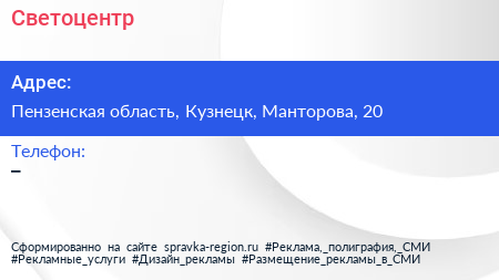Светоцентр по адресу Пензенская область, Кузнецк, Манторова, 20 в дальнейшем Организация, размещена в следующих категориях: