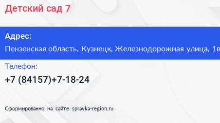 Детский сад №7 по адресу Пензенская область, Кузнецк, Железнодорожная улица, 1в в дальнейшем Организация, размещена в следующих категориях: