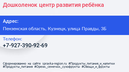 Дошколенок, центр развития ребёнка по адресу Пензенская область, Кузнецк, улица Правды, 3Б в дальнейшем Организация, размещена в следующих категориях: