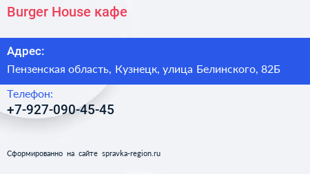 Burger House, кафе по адресу Пензенская область, Кузнецк, улица Белинского, 82Б в дальнейшем Организация, размещена в следующих категориях: