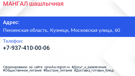 МАНГАЛ, шашлычная по адресу Пензенская область, Кузнецк, Московская улица, 60 в дальнейшем Организация, размещена в следующих категориях: