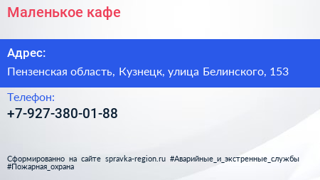 Маленькое кафе по адресу Пензенская область, Кузнецк, улица Белинского, 153 в дальнейшем Организация, размещена в следующих категориях: