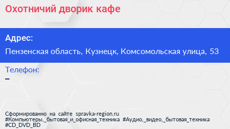 Охотничий дворик, кафе по адресу Пензенская область, Кузнецк, Комсомольская улица, 53 в дальнейшем Организация, размещена в следующих категориях: