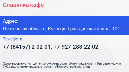 Славянка, кафе по адресу Пензенская область, Кузнецк, Гражданская улица, 104 в дальнейшем Организация, размещена в следующих категориях: