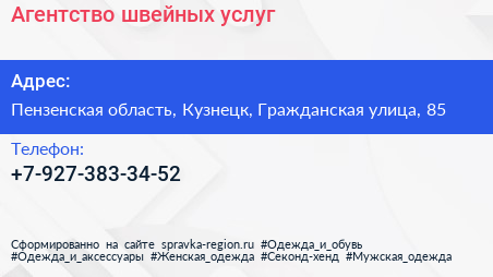 Агентство швейных услуг по адресу Пензенская область, Кузнецк, Гражданская улица, 85 в дальнейшем Организация, размещена в следующих категориях: