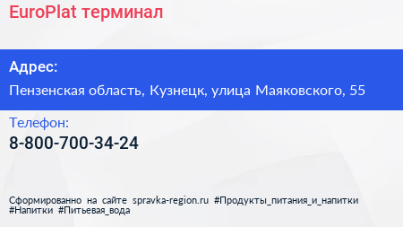 EuroPlat, терминал по адресу Пензенская область, Кузнецк, улица Маяковского, 55 в дальнейшем Организация, размещена в следующих категориях: