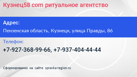 Кузнец58.com, ритуальное агентство по адресу Пензенская область, Кузнецк, улица Правды, 86 в дальнейшем Организация, размещена в следующих категориях: