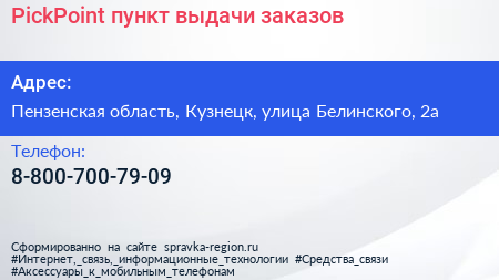 PickPoint, пункт выдачи заказов по адресу Пензенская область, Кузнецк, улица Белинского, 2а в дальнейшем Организация, размещена в следующих категориях: