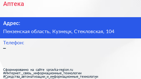 Аптека по адресу Пензенская область, Кузнецк, Стекловская, 104 в дальнейшем Организация, размещена в следующих категориях: