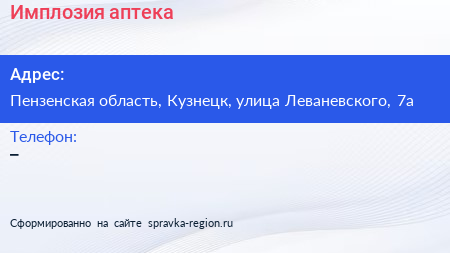 Имплозия, аптека по адресу Пензенская область, Кузнецк, улица Леваневского, 7а в дальнейшем Организация, размещена в следующих категориях: