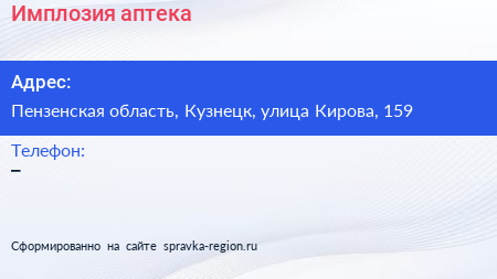 Имплозия, аптека по адресу Пензенская область, Кузнецк, улица Кирова, 159 в дальнейшем Организация, размещена в следующих категориях: