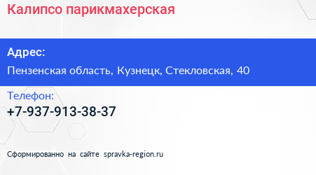 Калипсо, парикмахерская по адресу Пензенская область, Кузнецк, Стекловская, 40 в дальнейшем Организация, размещена в следующих категориях: