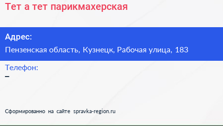 Тет-а-тет, парикмахерская по адресу Пензенская область, Кузнецк, Рабочая улица, 183 в дальнейшем Организация, размещена в следующих категориях: