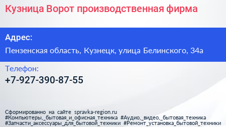 Кузница Ворот, производственная фирма по адресу Пензенская область, Кузнецк, улица Белинского, 34а в дальнейшем Организация, размещена в следующих категориях: