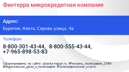 Финтерра, микрокредитная компания по адресу Бурятия, Кяхта, Серова улица, 4а в дальнейшем Организация, размещена в следующих категориях: