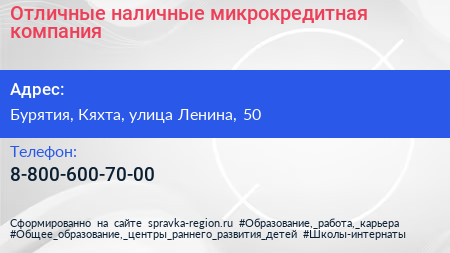 Отличные наличные, микрокредитная компания по адресу Бурятия, Кяхта, улица Ленина, 50 в дальнейшем Организация, размещена в следующих категориях: