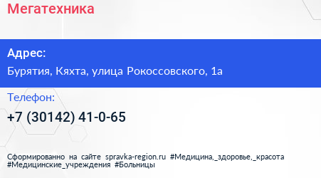 Мегатехника по адресу Бурятия, Кяхта, улица Рокоссовского, 1а в дальнейшем Организация, размещена в следующих категориях: