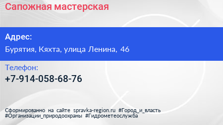 Сапожная мастерская по адресу Бурятия, Кяхта, улица Ленина, 46 в дальнейшем Организация, размещена в следующих категориях: