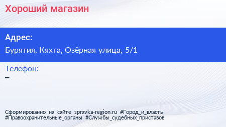 Хороший, магазин по адресу Бурятия, Кяхта, Озёрная улица, 5/1 в дальнейшем Организация, размещена в следующих категориях: